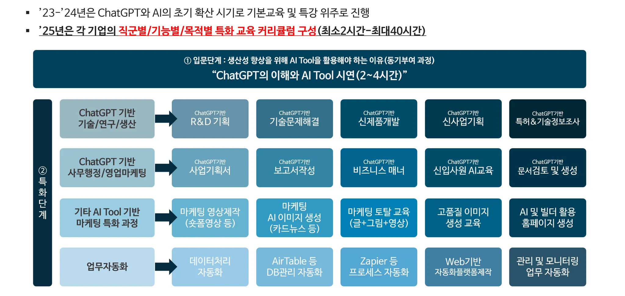 ๋ฌด ํจ์จํ์ ์์ฐ์ฑ ํฅ์์ ์ํ AI ๋๊ตฌ๋ค์ ์ฐ๊ตฌํ๊ณ ๊ต์ฌ๋ฅผ ๊ฐ๋ฐํ์ฌ ๋ณด๊ธํฉ๋๋ค. ์ด๋ฅผ ํตํด ๋ํ๋ฏผ๊ตญ ์ ์ฒด์ AI ํ์ฉ ๊ฒฝ์๋ ฅ ๊ฐํ์ ๊ธฐ์ฌํฉ๋๋ค.