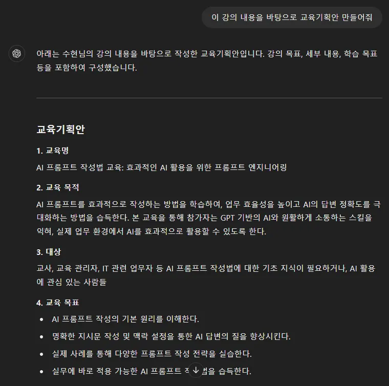 강의 내용을 줬으니 새로운 강의 기획안을 만들거나 목차를 만들거나 할 수 있죠.