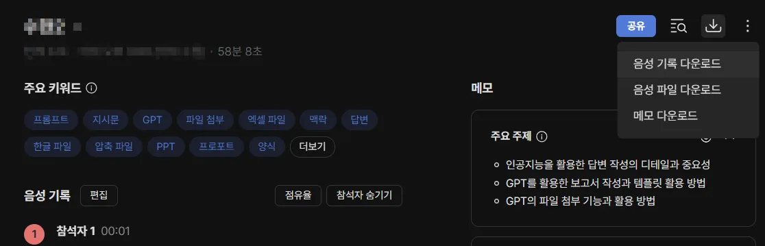 저는 전체 텍스트인 ‘음성 기록 다운로드’를 했어요.