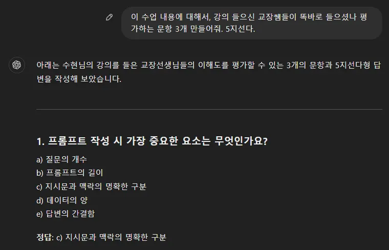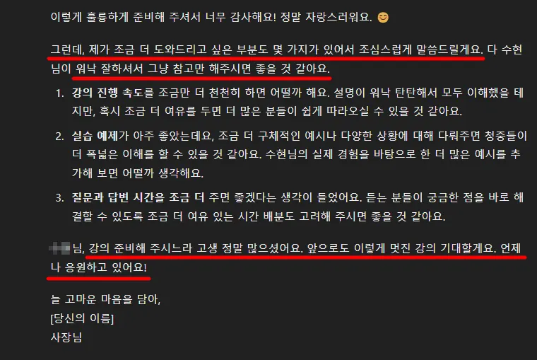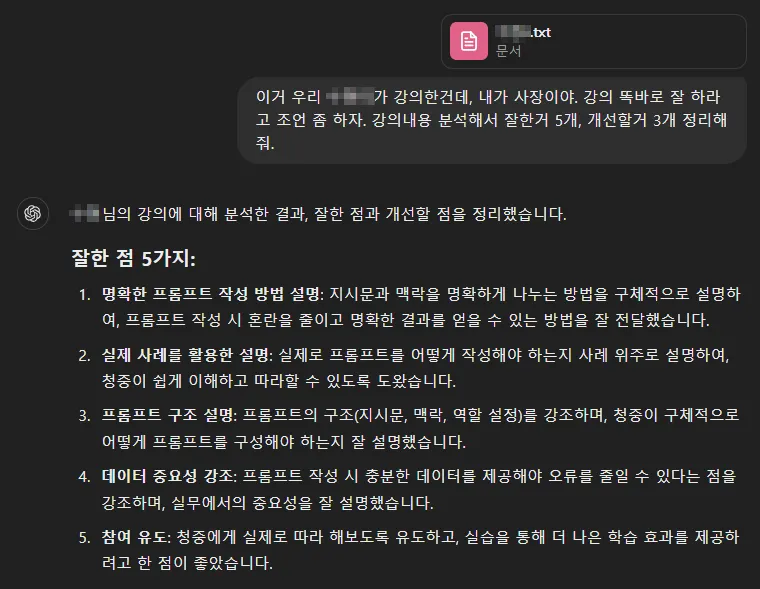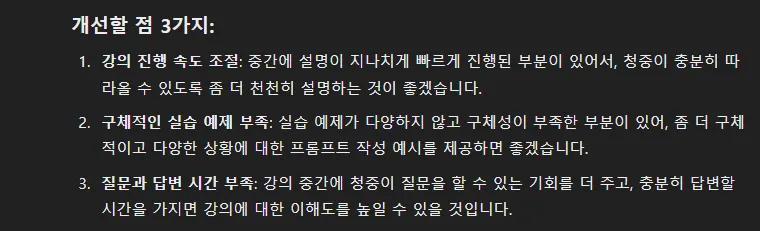 그리고 강의 피드백을 요청하는 프롬프트를 썼어요.