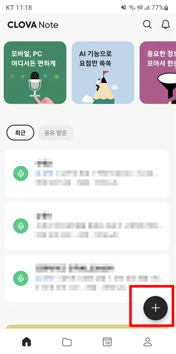 강의가 시작되면 폰에서 녹음( + 표시) 버튼 눌러줍니다.