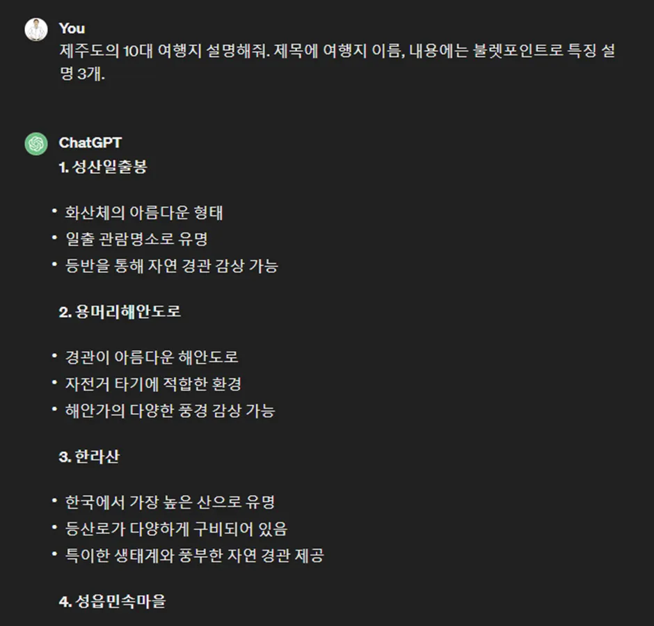 우선 GPT에게서 여행지 이름과 특징 설명을 받아냅니다.