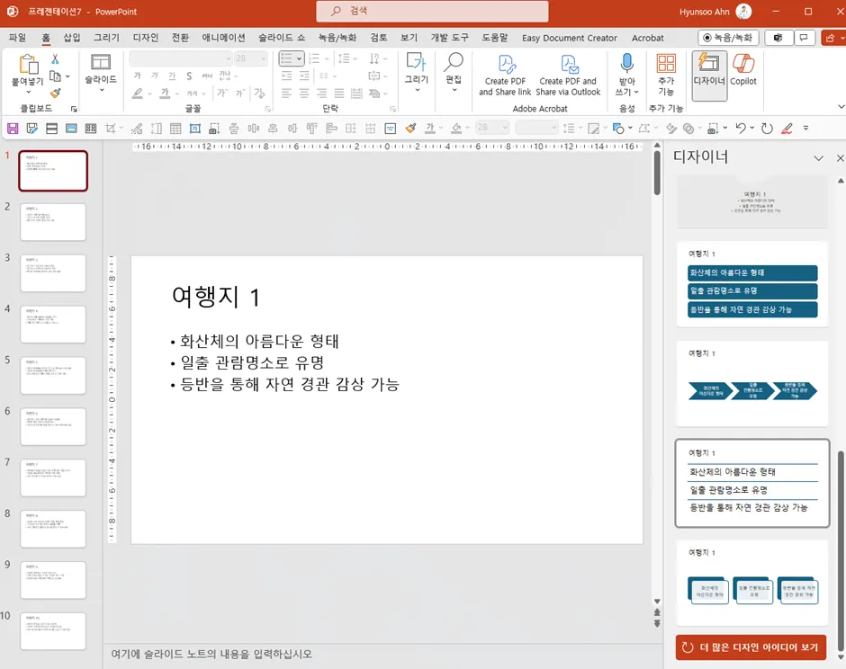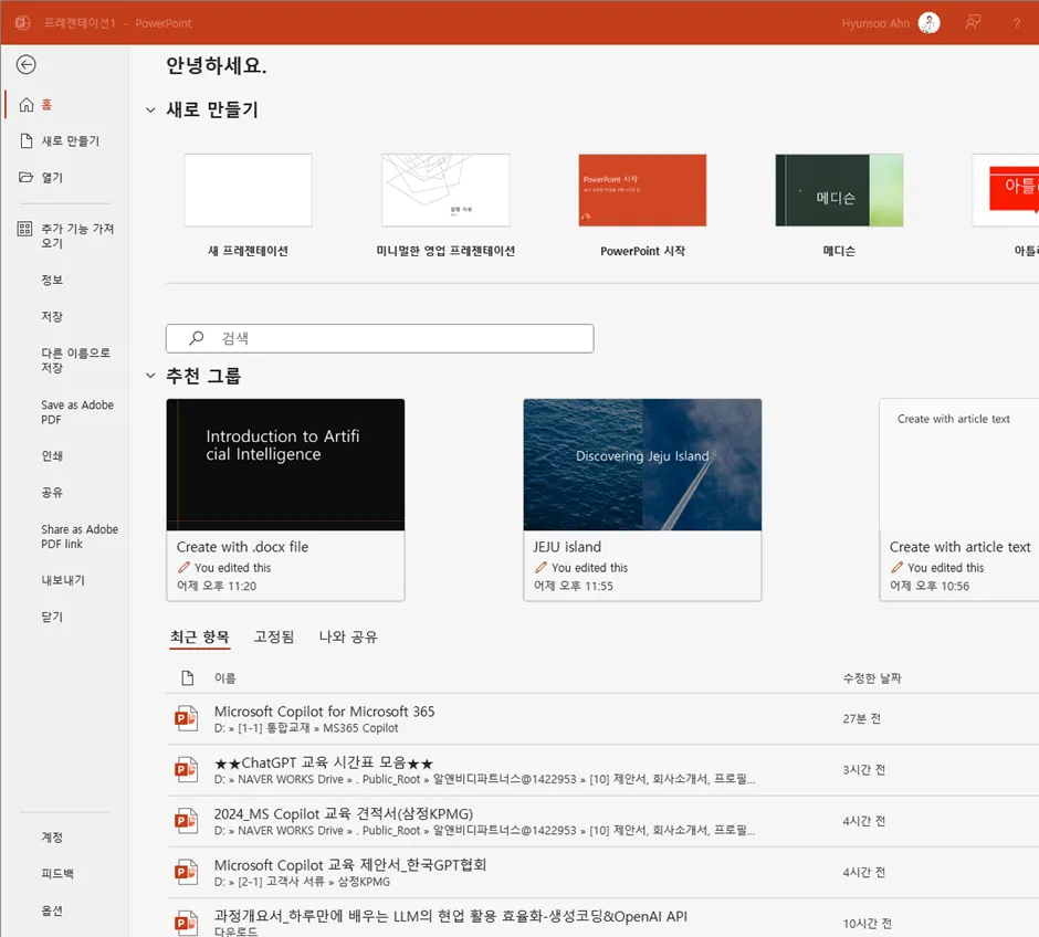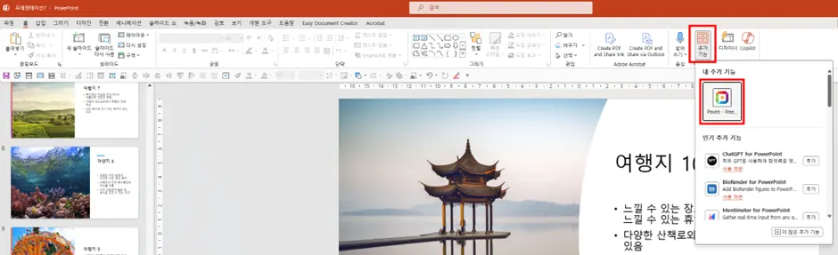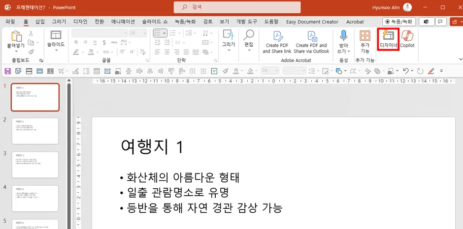 (※ MS designer는 구독형 서비스인 MS365에만 있습니다. 한번만 사면 평생 쓸 수 있는 Office2021 같은 설치형 MS 오피스에는 이 기능이 없습니다. ㅜㅠ)