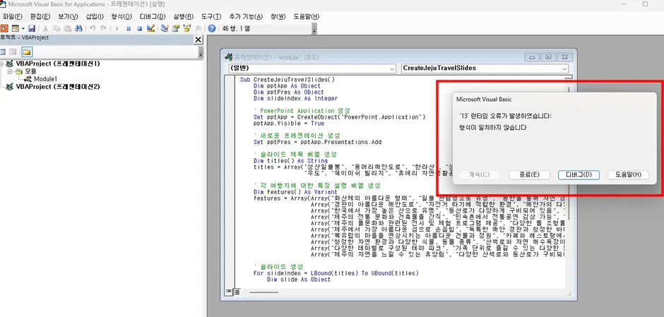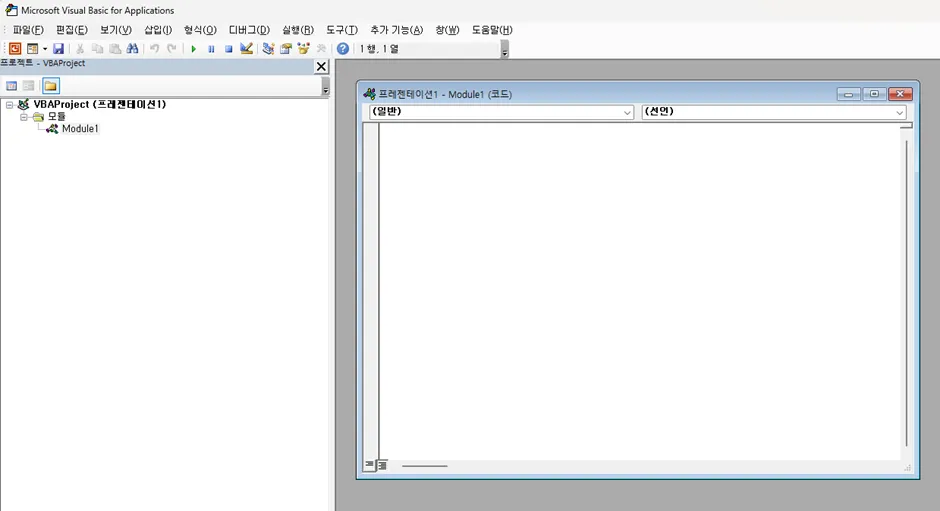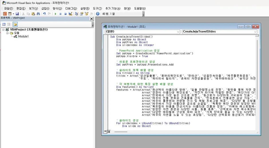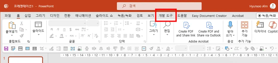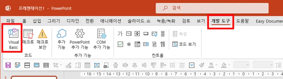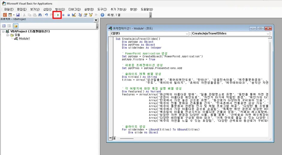 3단계. 파워포인트 개발도구에서 VBA 복붙하고 실행한다 (PPT 자료 뼈대가 만들어짐)