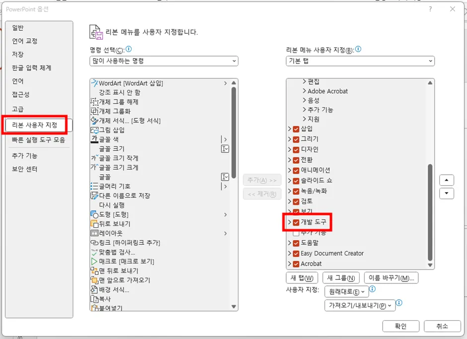 리본 사용자 지정 누르고, ‘개발 도구’를 토글 온(on) 해주고 확인 눌러줍니다.