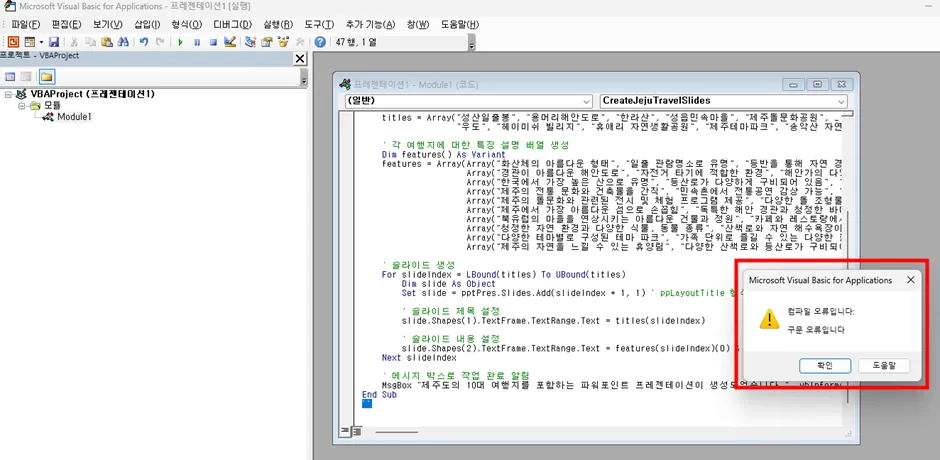 아까 GPT가 만들어준 파워포인트 VBA 코드를 복사해옵니다.
