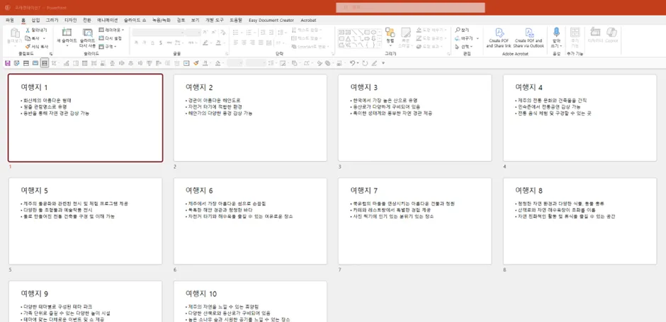 파워포인트에서 이걸 실행하면 우리가 원하는 만큼의 장표가 자동으로 만들어집니다. 각 장별로 title과 description이 모두 반영되어 있습니다.