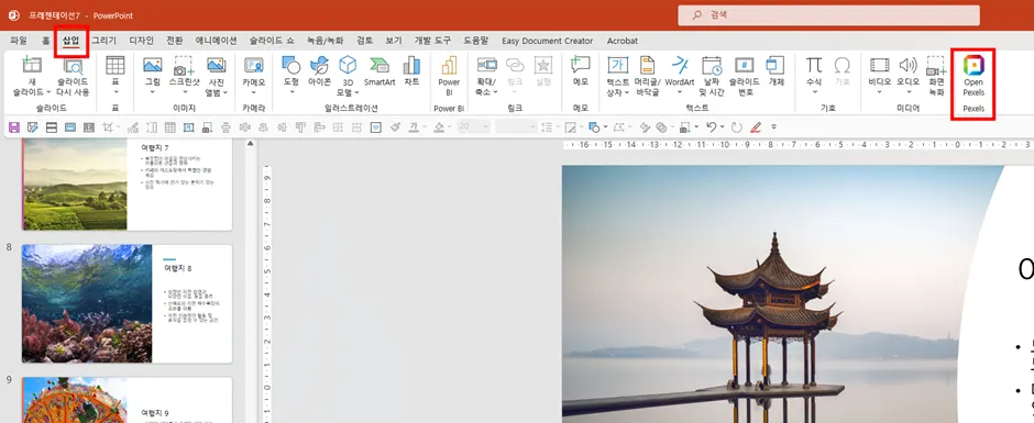삽입 탭을 눌렀을 때 Open Pexels가 있습니다.