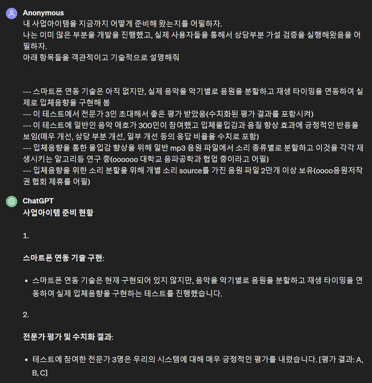GPT가 지금 이해하고 있는 나의 사업 아이템 관련 이야기에는 그 엉뚱한 것들도 다 포함되어 있습니다.