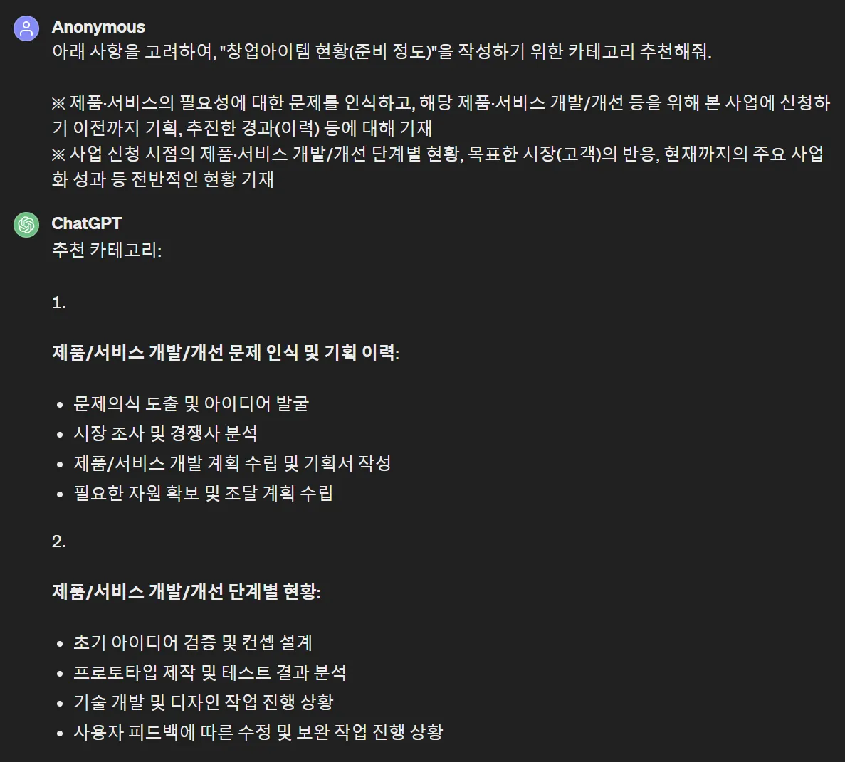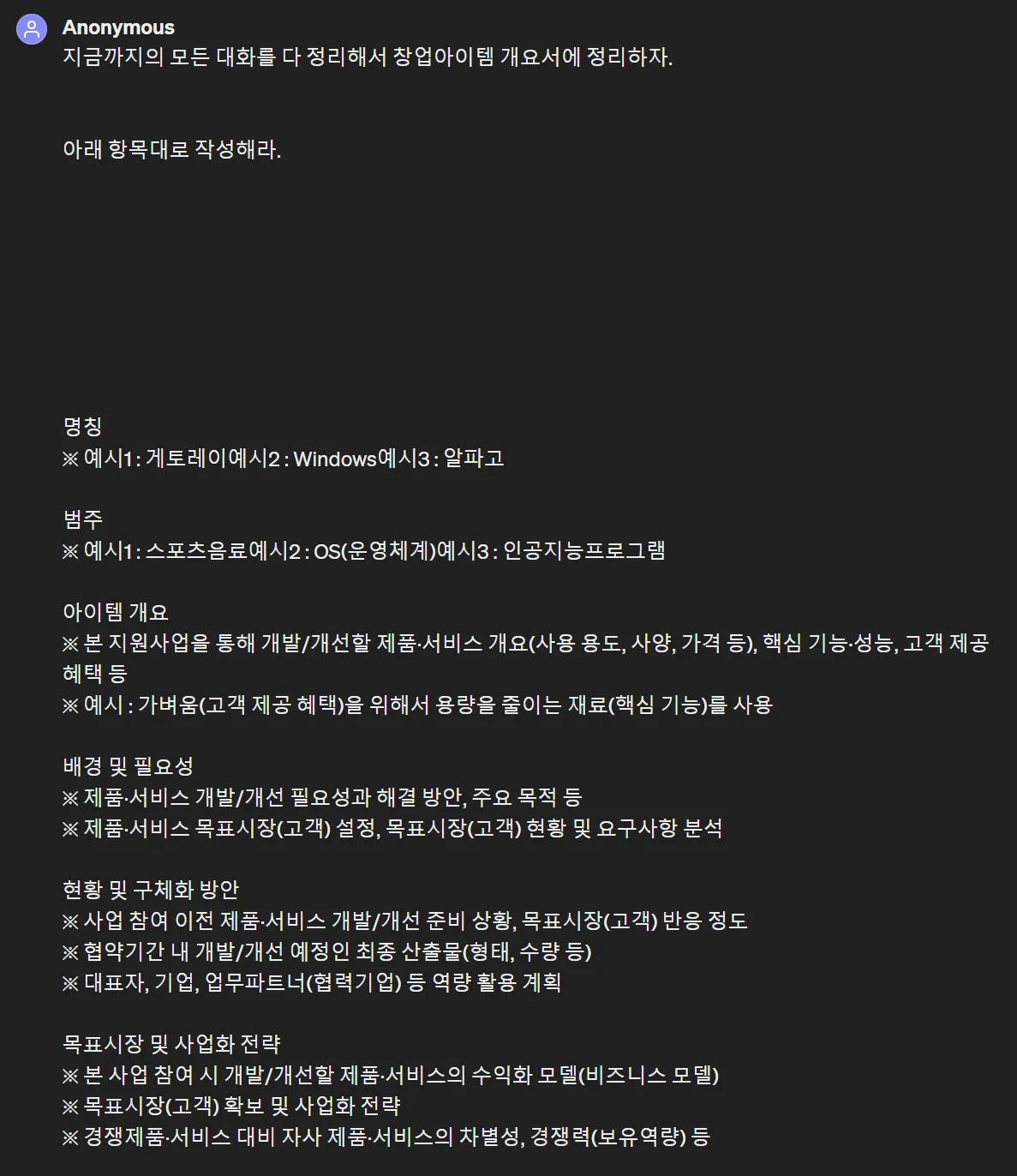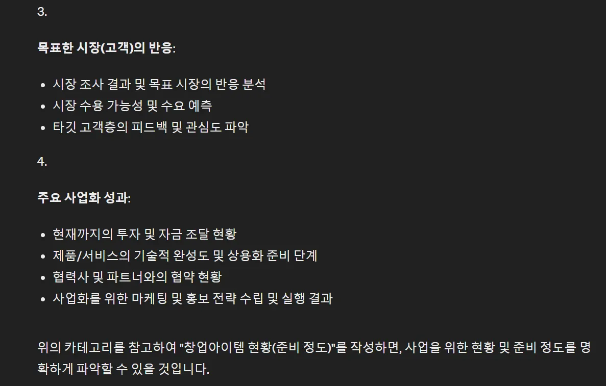 사업계획서 양식에서 요구한 현황(준비정도)를 instruction에 넣었고,