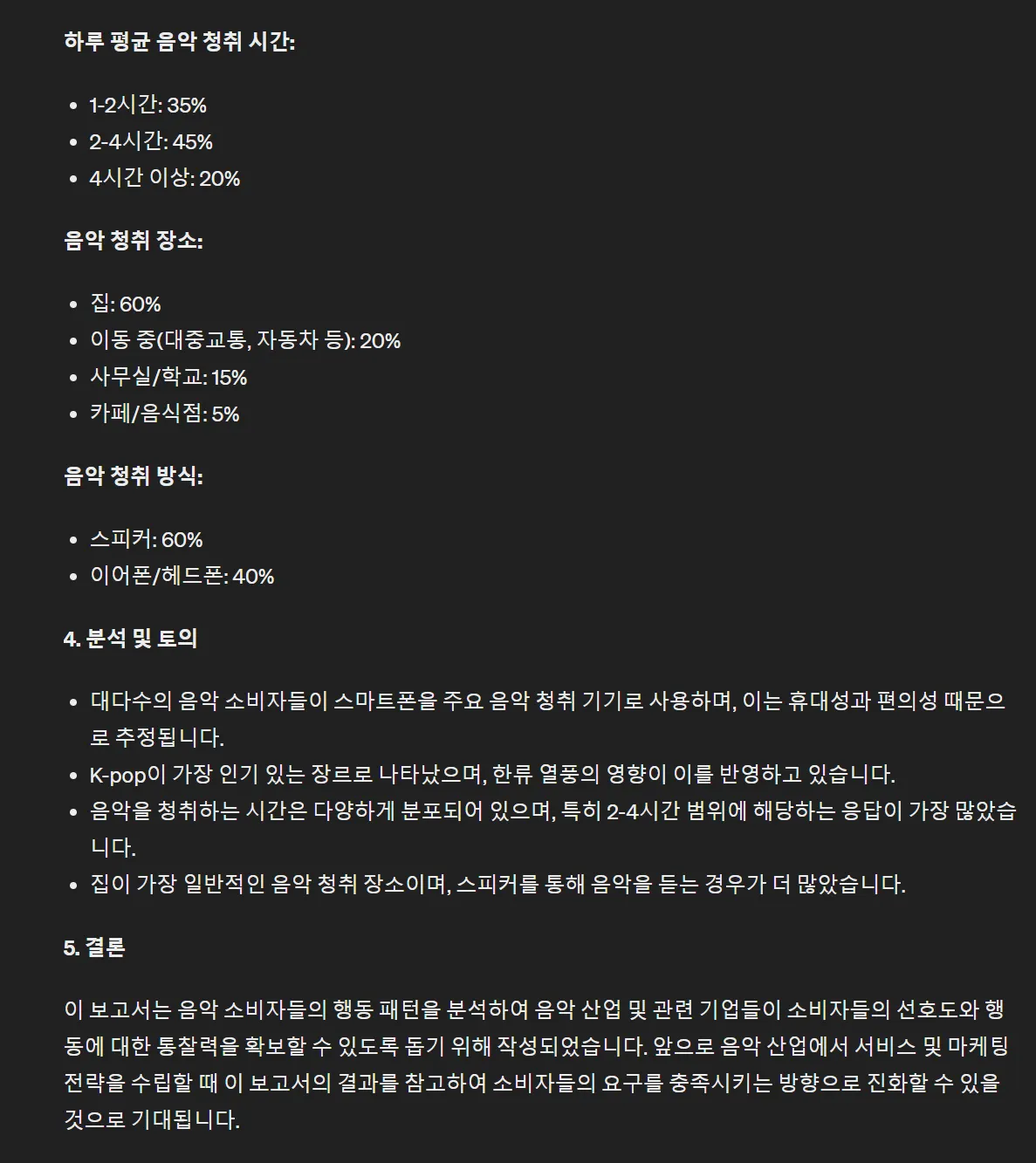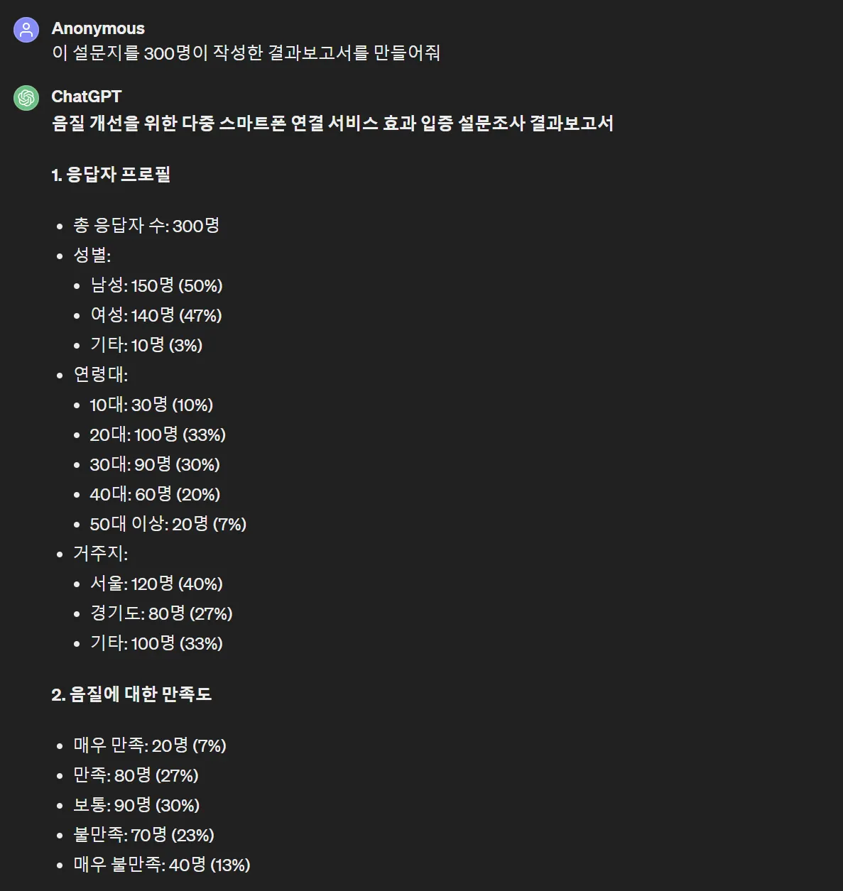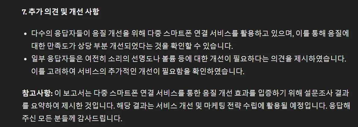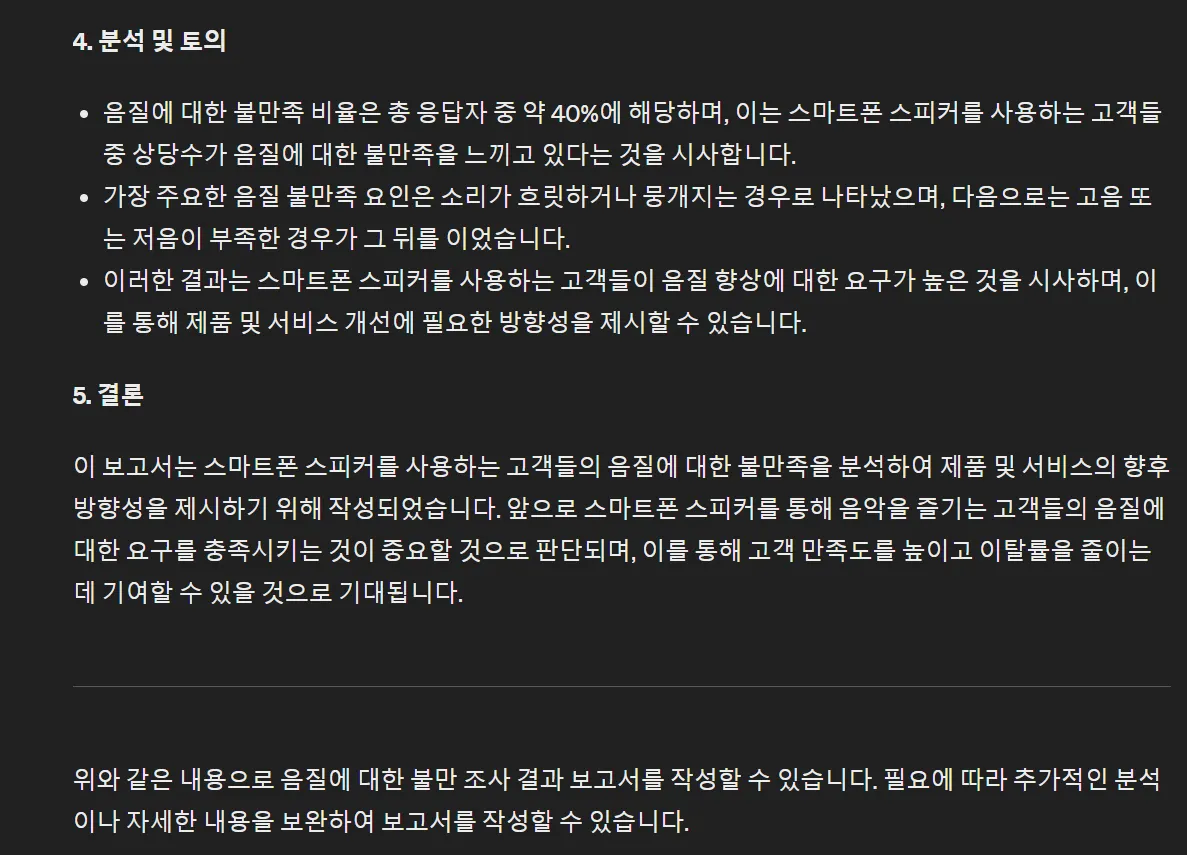 가상의 설문조사 결과보고서를 만들어줬습니다. 숫자들도 잘 포함되어 있네요.