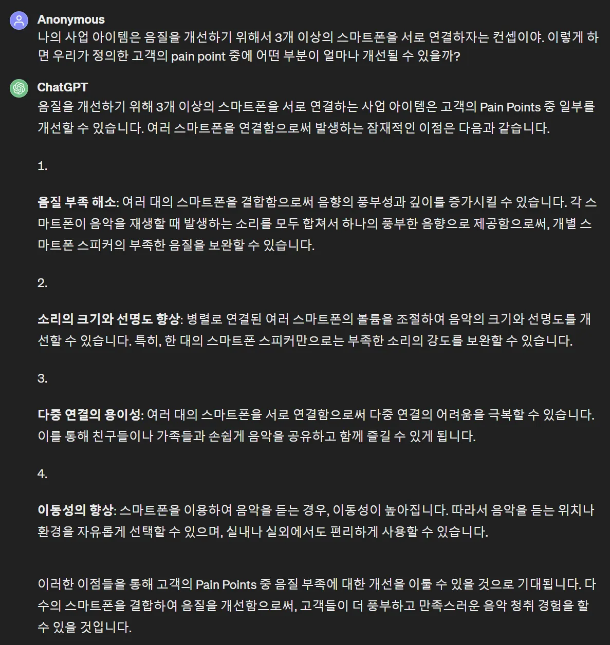 하나의 chat에서 이 모든 대화를 하고 있기 때문에 이쯤되면 GPT는 나의 사업 아이템에 대해서 잘 이해하고 있는 전문가가 되어 있습니다.