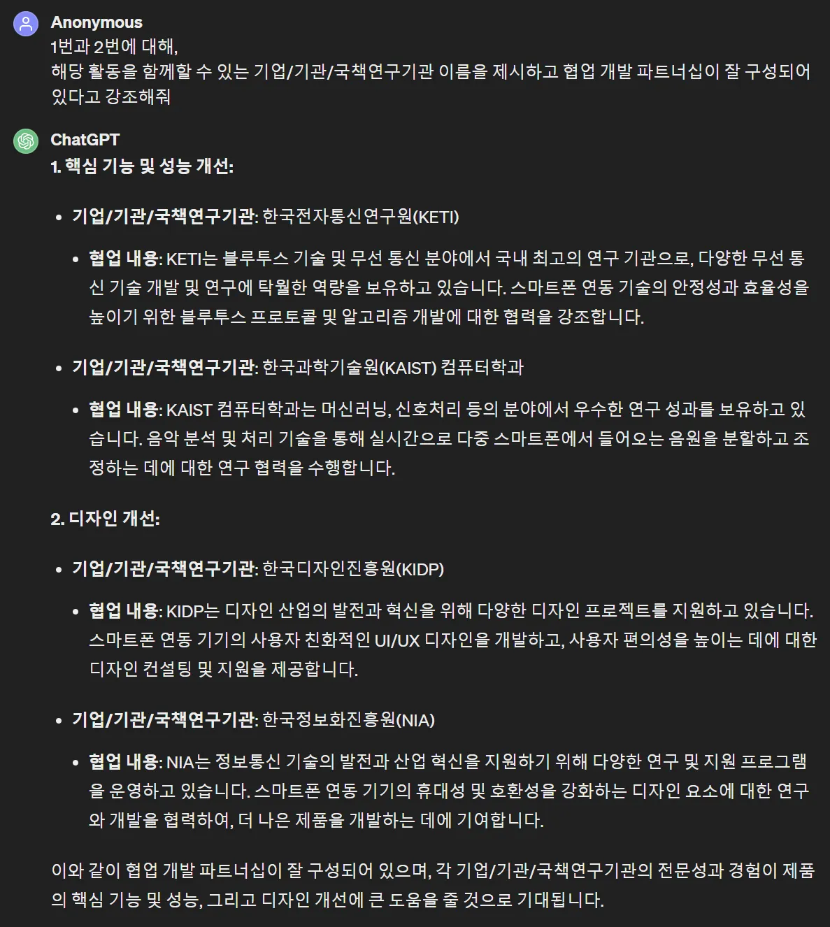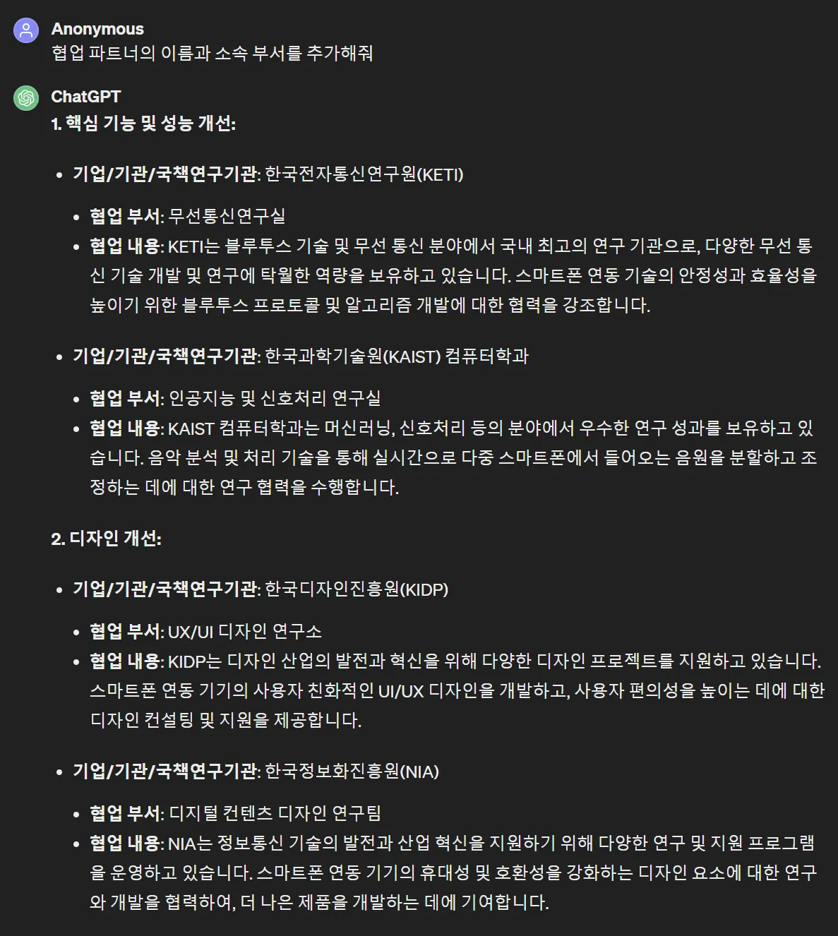 핵심 기능, 성능 개발을 위한 외부 파트너십 내용도 샘플을 만들어 봤습니다.