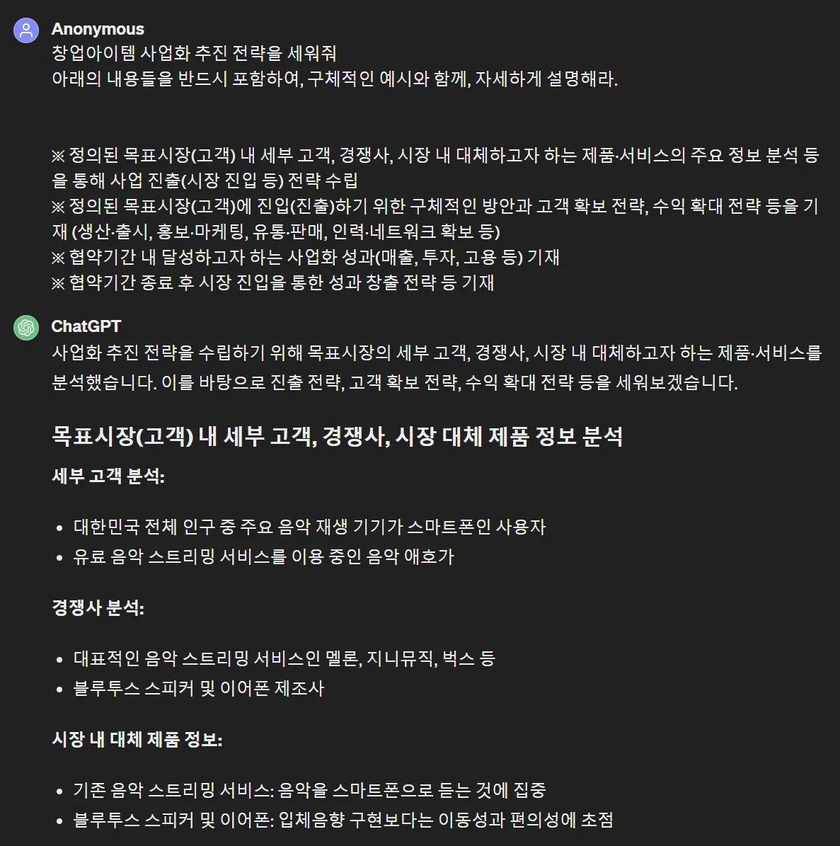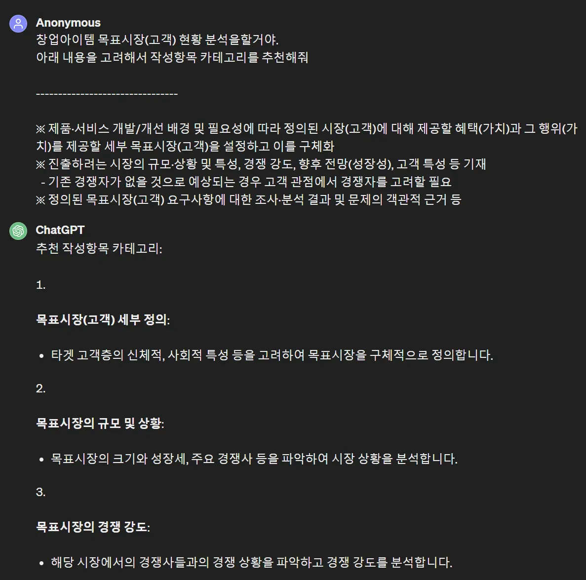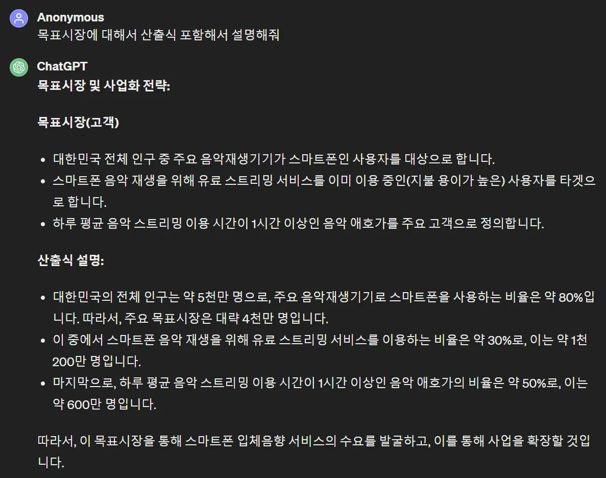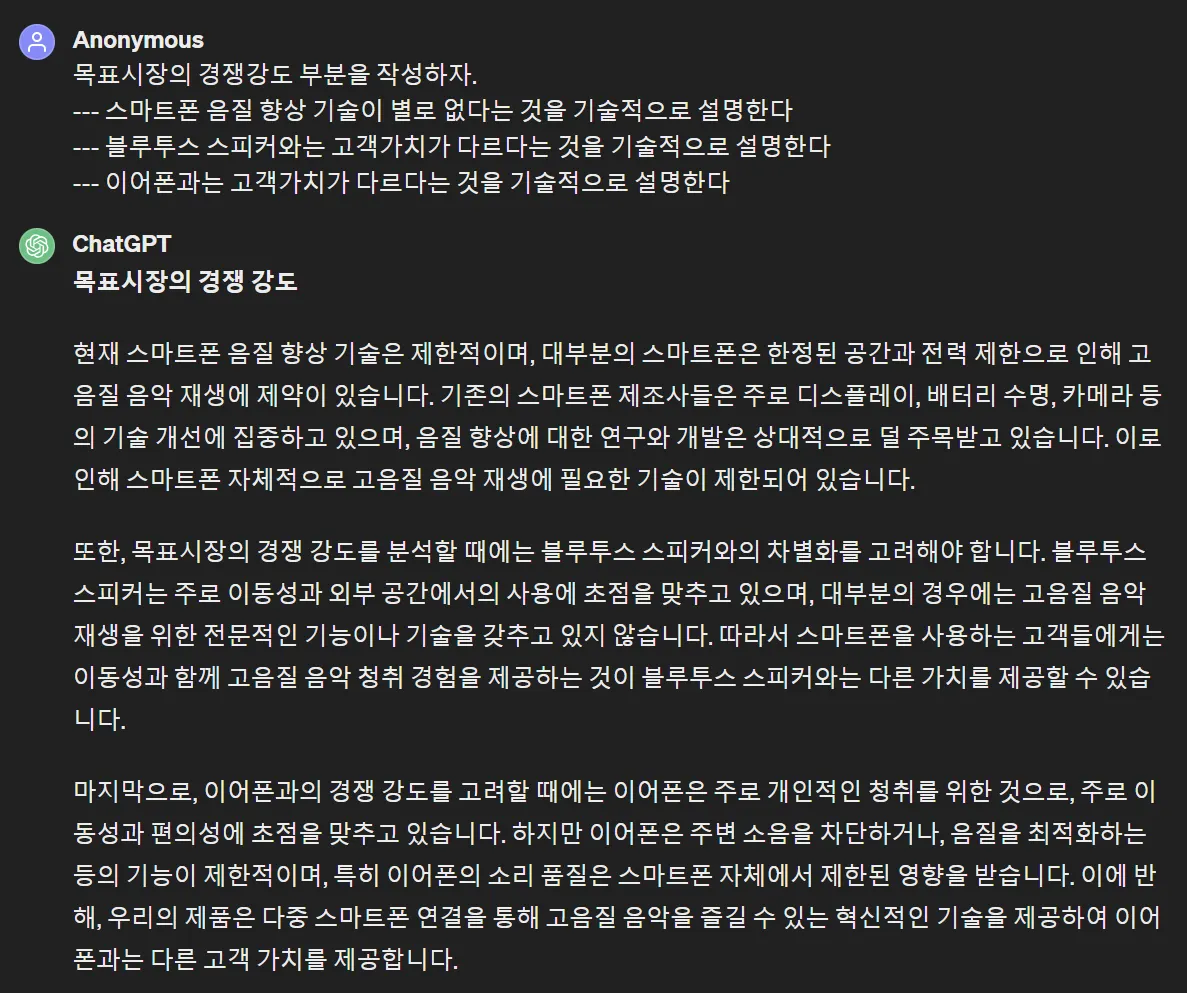 2) 사업계획서에 들어가야 할 시장 분석, 고객 분석, 고객 가치 분석, 경쟁 분석, 목표 매출액 산출 등의 과정을 GPT와 대화하며 초안 작성
