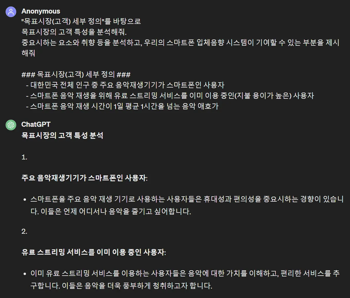 이걸 context로 주면서 목표시장의 고객 특성을 작성시켰어요