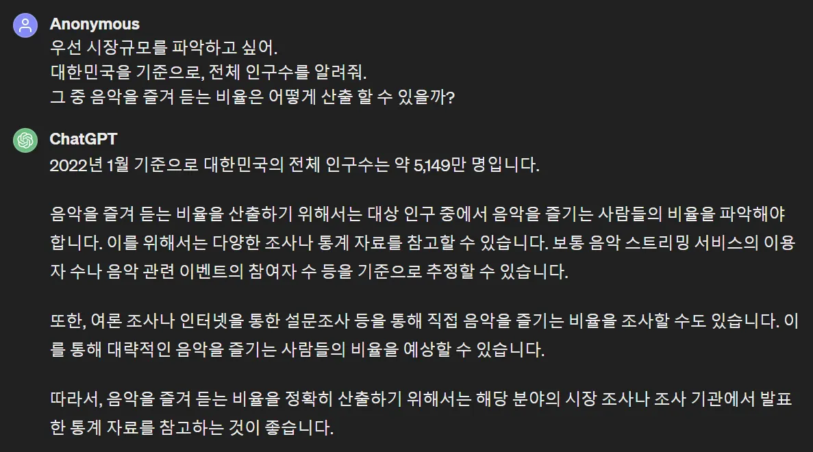 시장규모를 계산해 달라고 하면 당연히 안 해 줍니다. 아시다시피 GPT에게는 인터넷이 없잖아요.