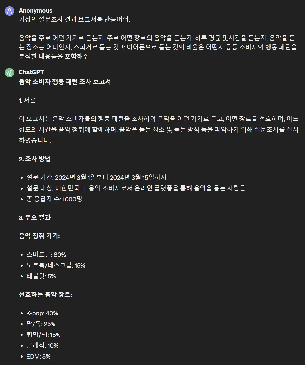 어떤 설문조사를 해야 이 주장을 설득력 있게 할 수 있을지가 궁금해서, 이번에도 GPT에게 가상의 설문조사 보고서 작성을 시킵니다.