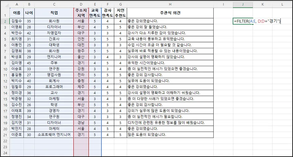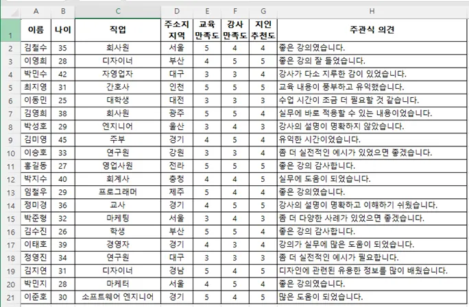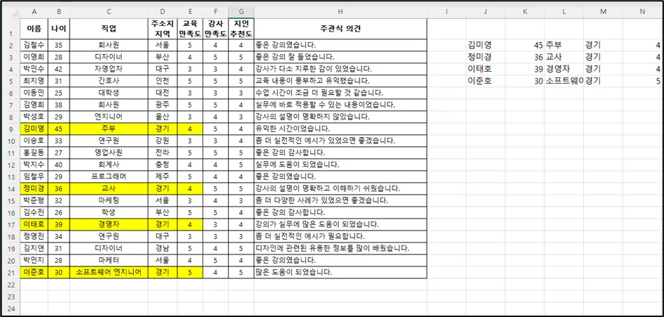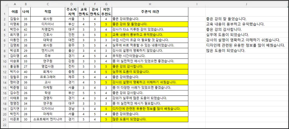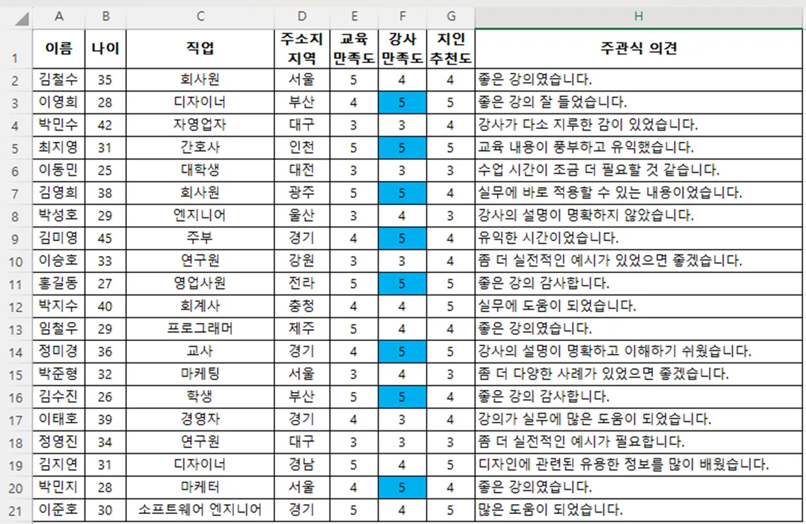 F열 강사 만족도에서 Best인 5점과 Worst인 1점은 색깔을 칠해볼게요.