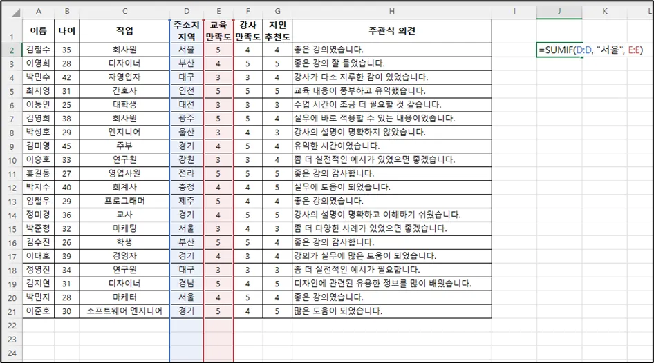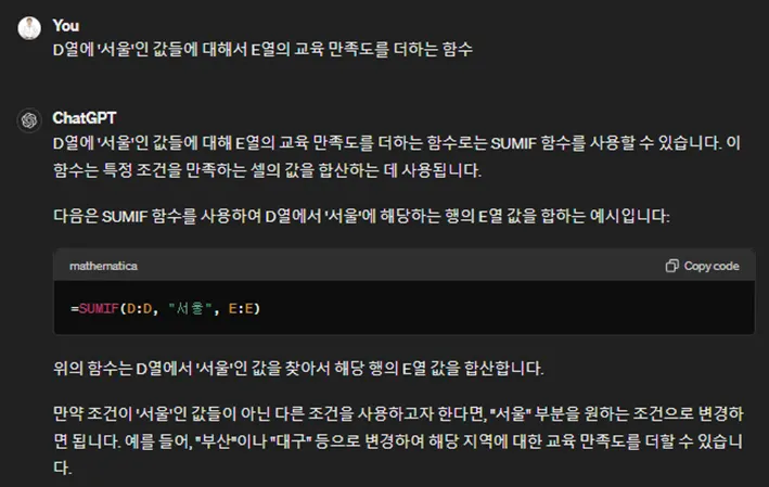 Copy code 버튼 활용해서 편리하게 복붙해줍니다. =SUMIF(D:D, "서울", E:E)