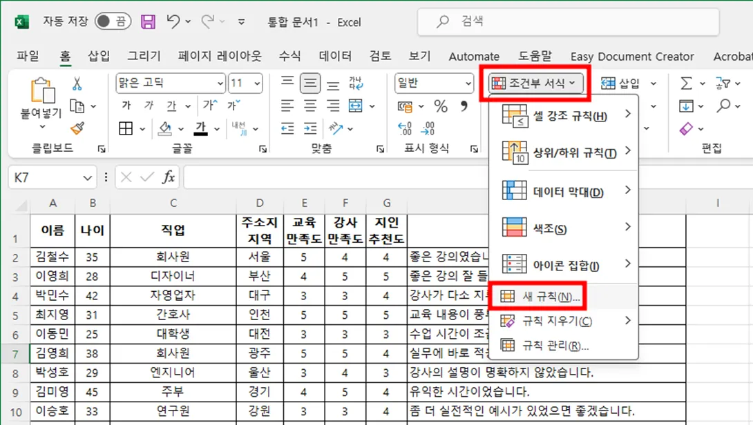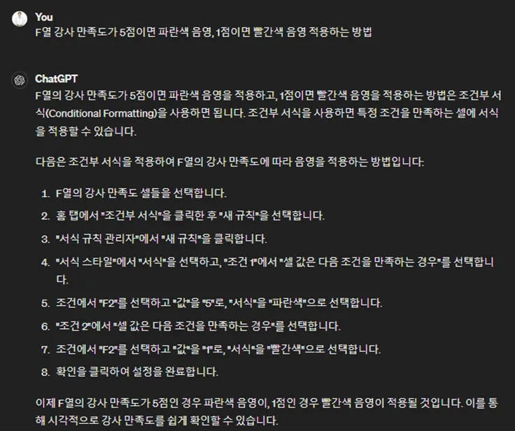 GPT 설명을 참고하여 ‘조건부 서식’ 지정했어요.