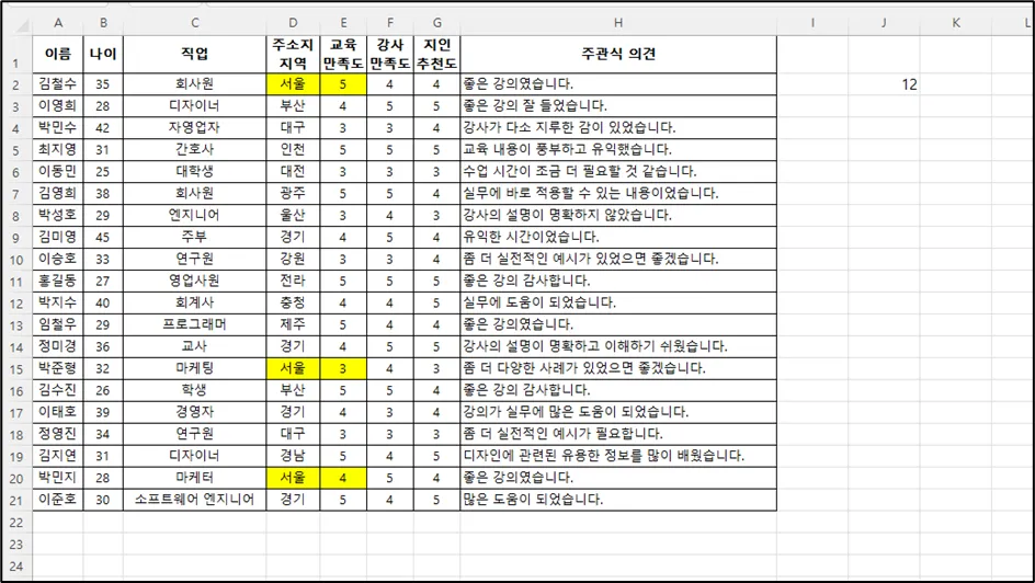 ‘서울’ 데이터만 3개 가져와서 합계(sum) 12를 잘 보여주고 있네요.