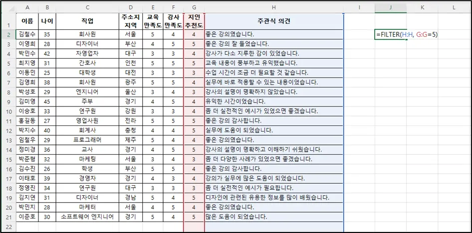 ‘지인 추천도’에 5점 만점을 준 사람들이 쓴 주관식 의견만 모두 필터링하기.