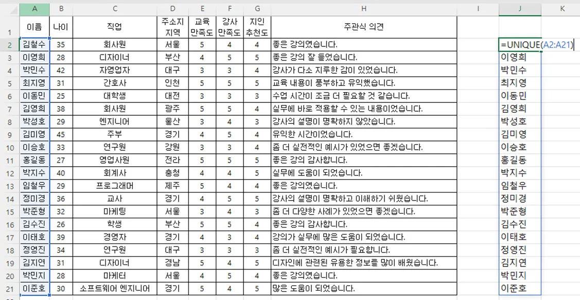 이렇게 하나의 셀에 복붙해서 넣어주면 unique 데이터 전체가 행(row)으로 다 삽입되네요.