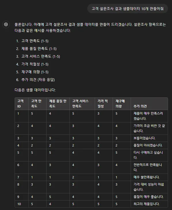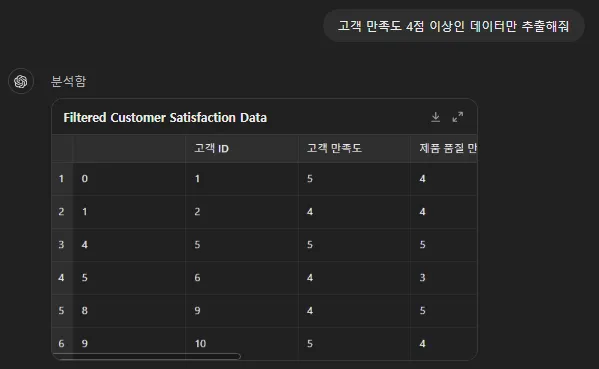 고객 만족도 4점 이상인 데이터만 추출하라는 프롬프트에 대해서