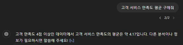 아까 대화 나눈 ‘고객 만족도 4점 이상’이라는 필터 먹힌 범위 내에서 평균을 구해서 4.17 이라고 대답하네요.
