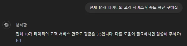 이번에는 “전체 10개 데이터의 고객 서비스 만족도 평균 구해줘”라는 프롬프트에 대한 실행 코드를 확인해 봅니다.
