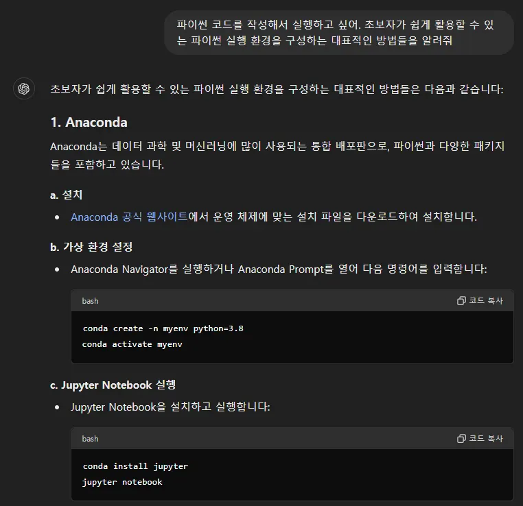챗GPT로 코드 작성을 하되 이것을 별도의 실행 환경에서 run 하는 것이 훨씬 편리합니다.