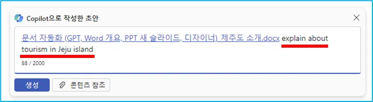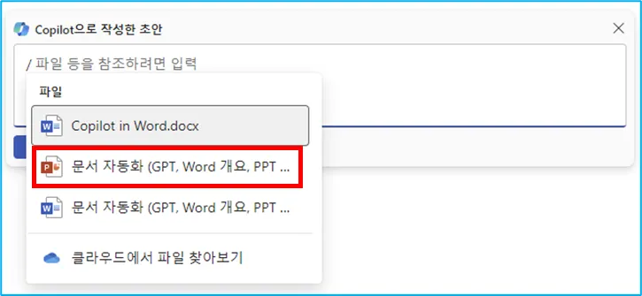 워드 파일의 핵심을 요약하여 파워포인트를 만들고 그것을 팀즈에 공유하고, 그 파일을 첨부해서 누군가에게 보내는 이메일까지 작성해버리는거죠.