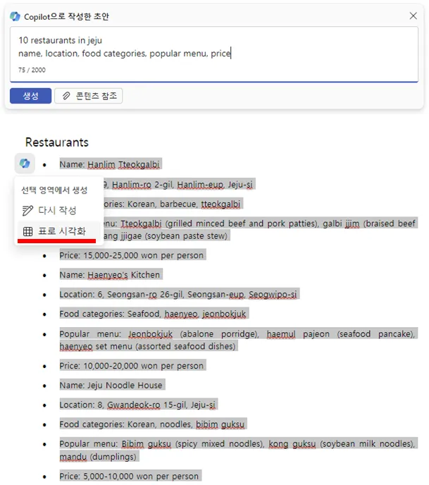 표로 만들 수 있고, 만들어진 표에 행과 열을 추가하거나, 열을 분할하거나 모두 프롬프트로 가능합니다.