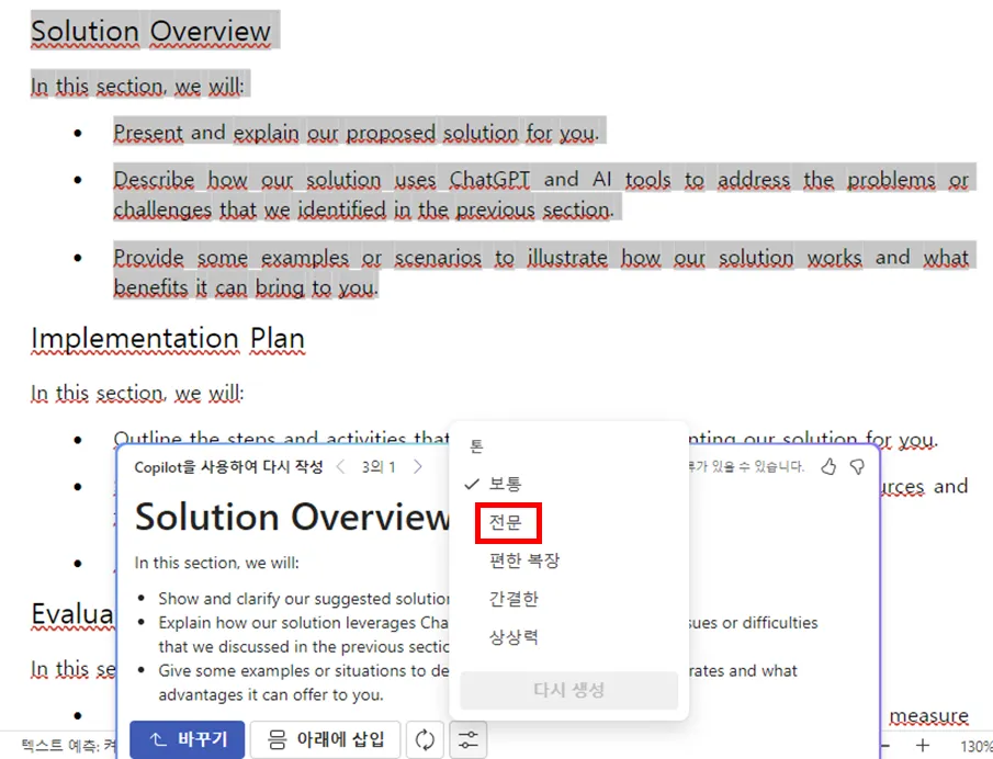 특정 부분에 글을 추가하고 싶지만 딱히 아이디어가 떠오르지 않을 때는 코파일럿이 추천을 해줍니다.