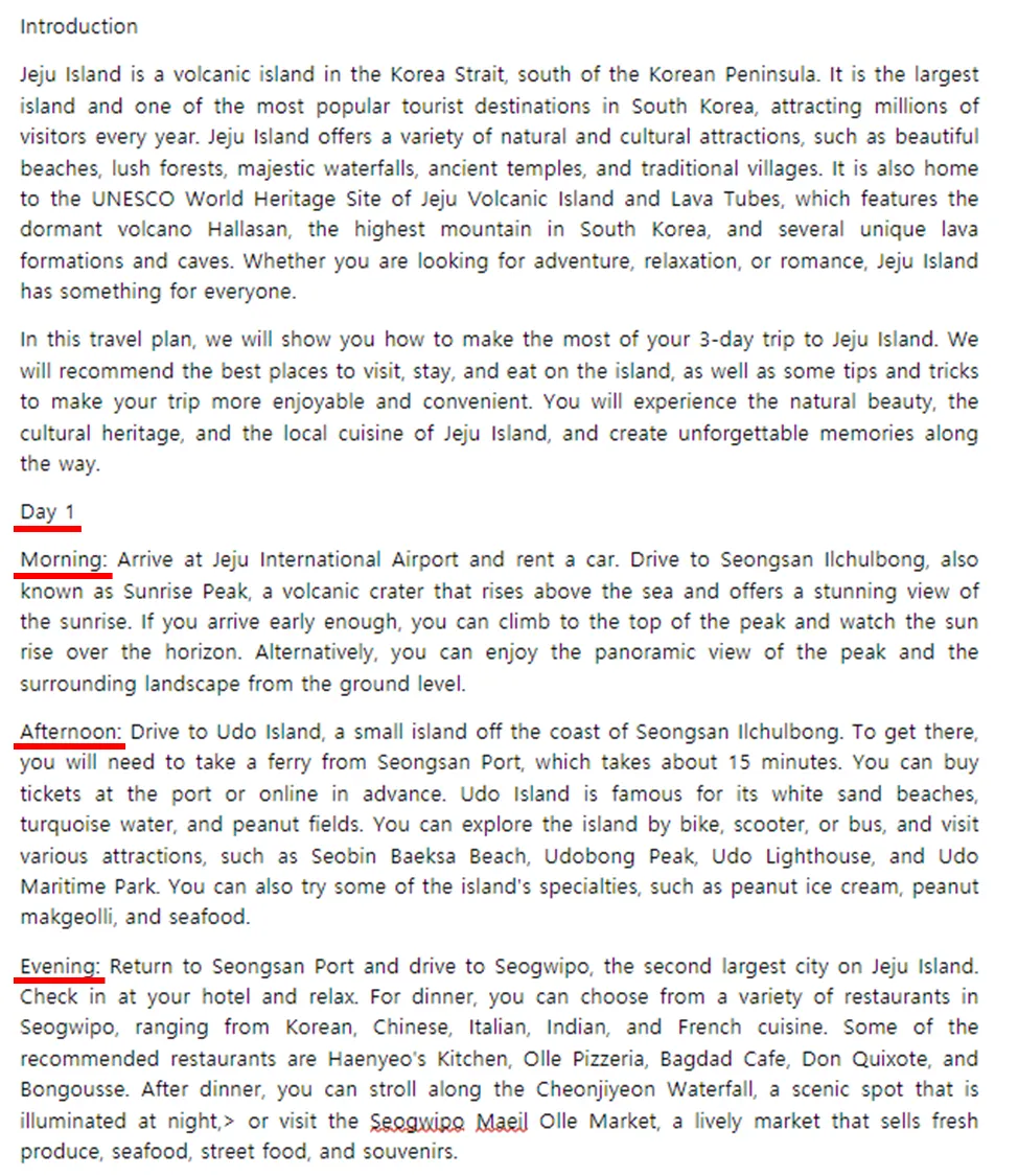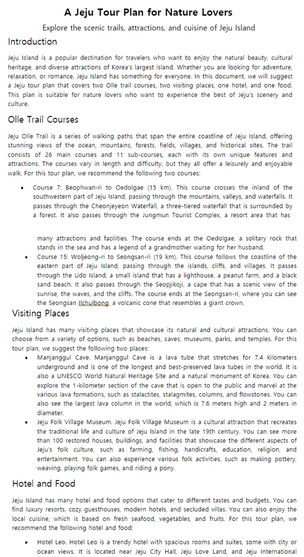 제주 올레길 정보 파일, 제주 관광지 정보 파일, 제주 호텔숙박지 정보 파일, 이렇게 3개를 주면서 나의 여행 계획을 세워달라 했습니다.