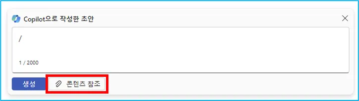 ‘콘텐츠 참조’를 클릭하거나 프롬프트 창에서 /(슬래시)를 입력하면 내 업무 파일들이 뜹니다.