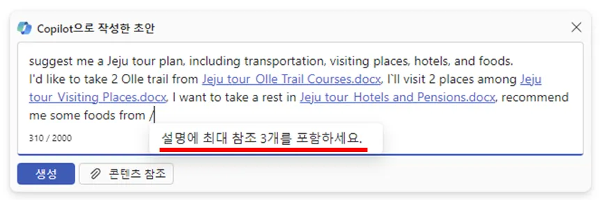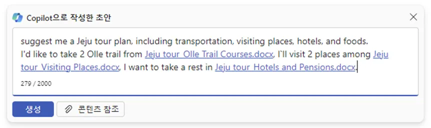 3개의 파일에 각각 정보가 흩어져 있는 상황에서, 코파일럿이 혼자 자료 찾아가며 내용 선택해가며 여행계획을 세웠네요.