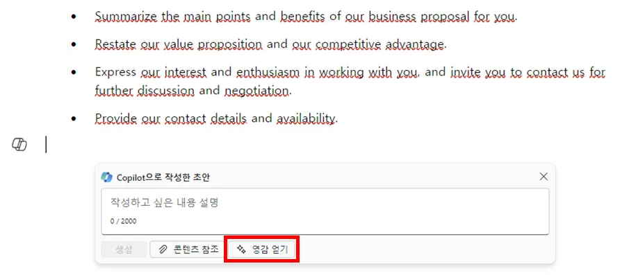 이렇게 글을 특정 부분에 커서를 놓고, 코파일럿 불러서 ‘영감 얻기’ 눌러줍니다.