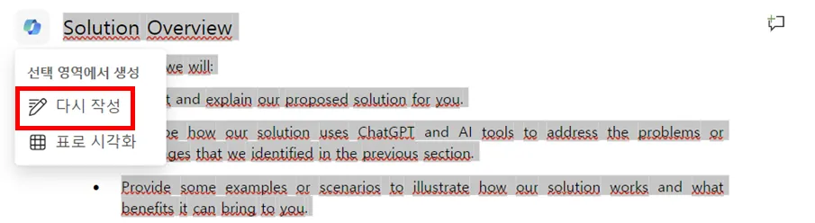 생성된 글을 일부부만을 선택해서 ‘다시 작성’을 할 수 있습니다.