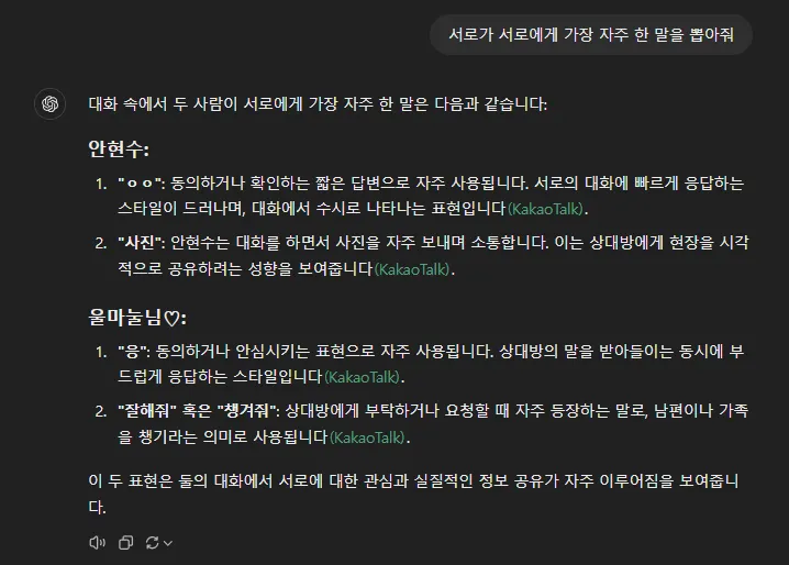 카톡 대화만 입력된 것이라 한계가 있기도 하지만,