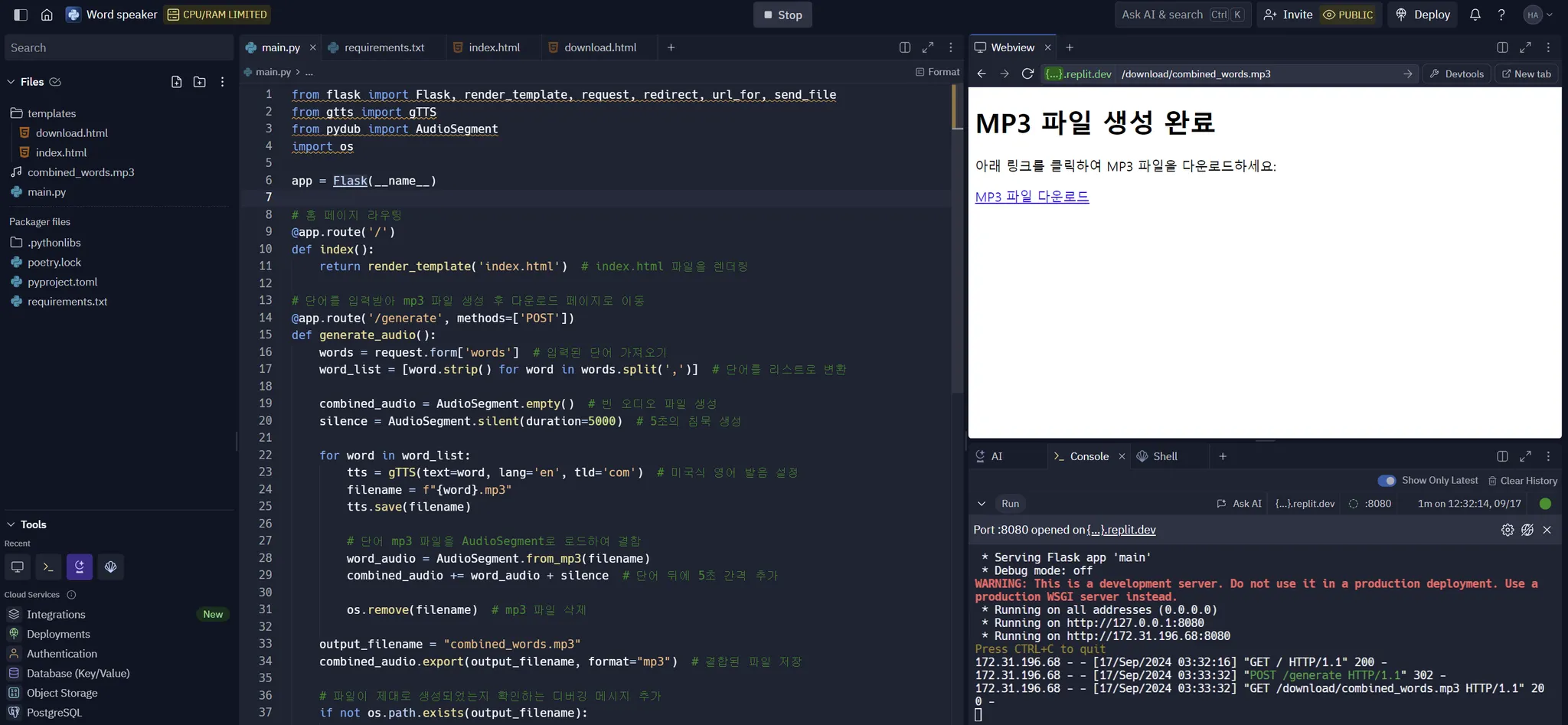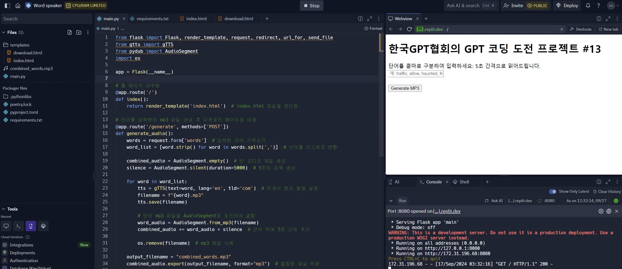 리플릿에 접속해서 Run을 눌러놔야 웹페이지가 작동합니다.