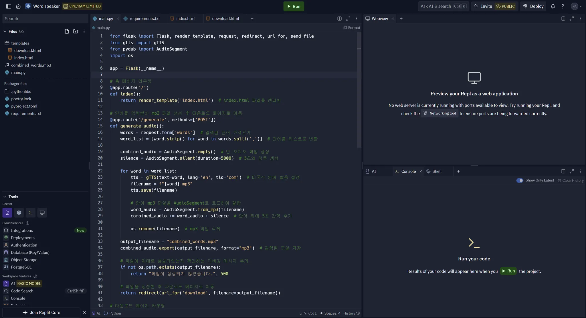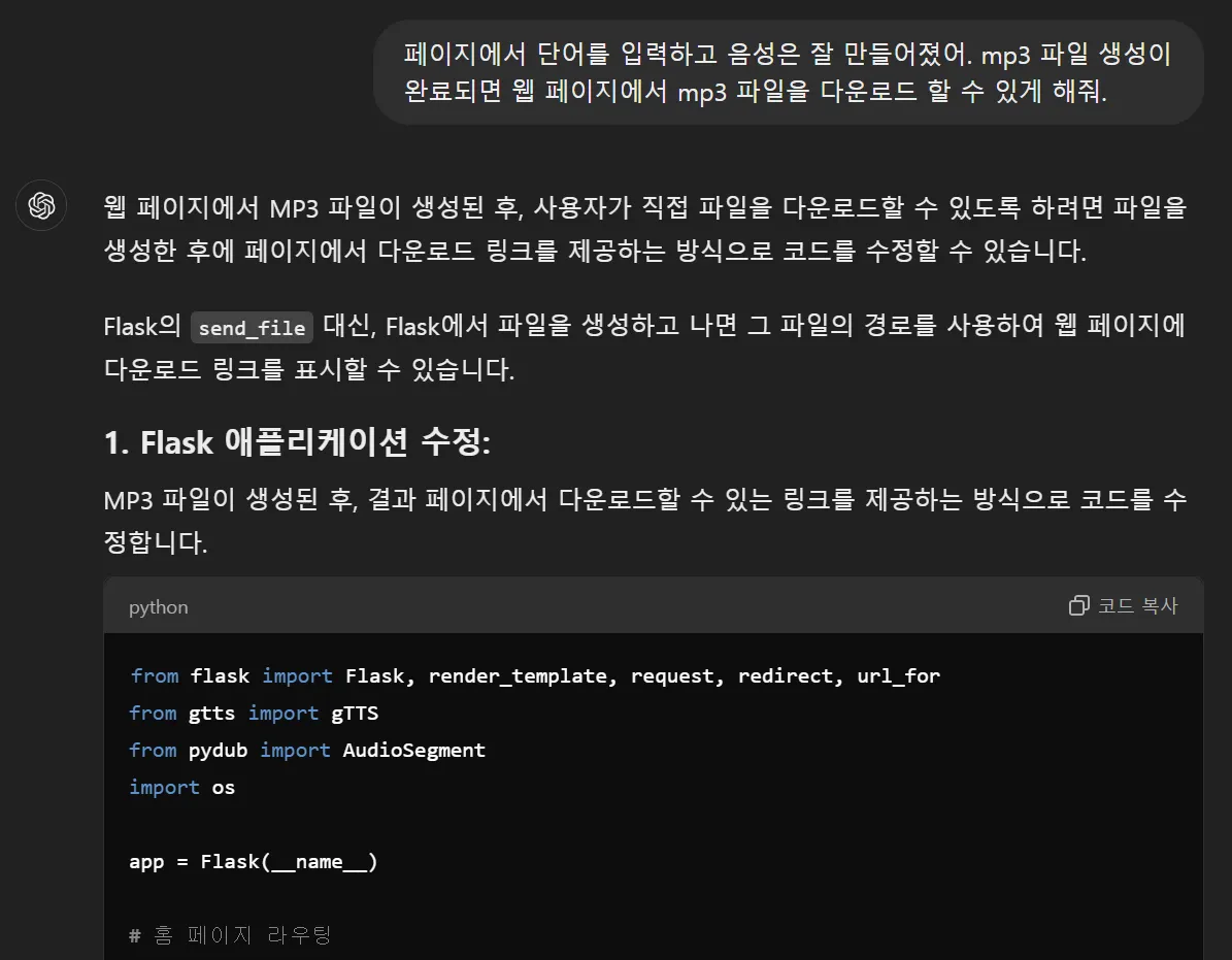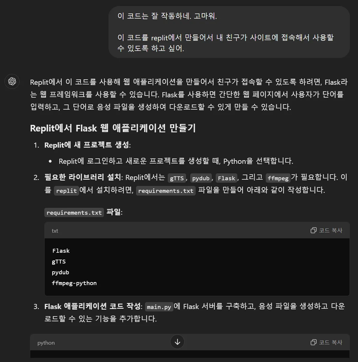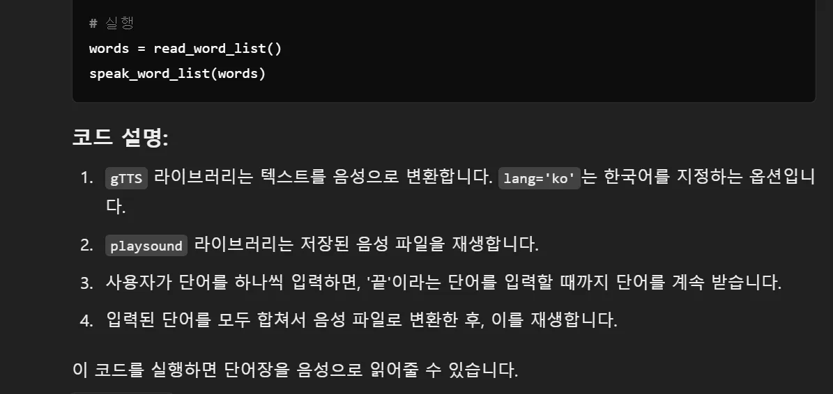 main.py 파일에 넣을 코드도 따로 주고, (text-speech 변환 등 기능을 담당)