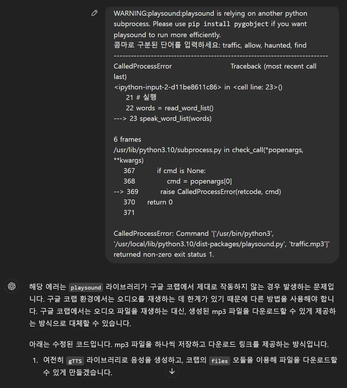 코랩에서 뜬 오류 메세지를 그대로 복사해서 챗GPT에게 보고합니다.
