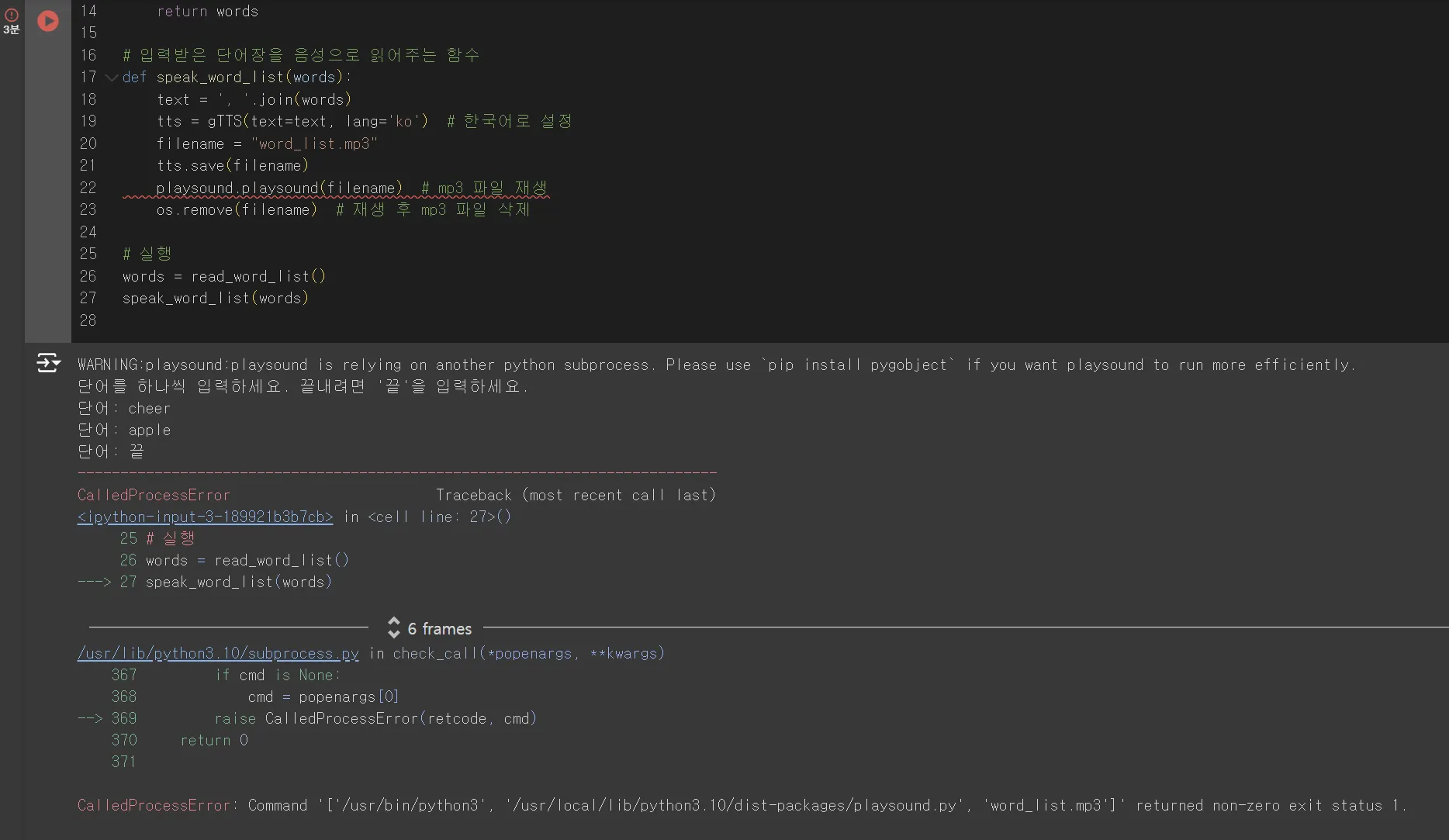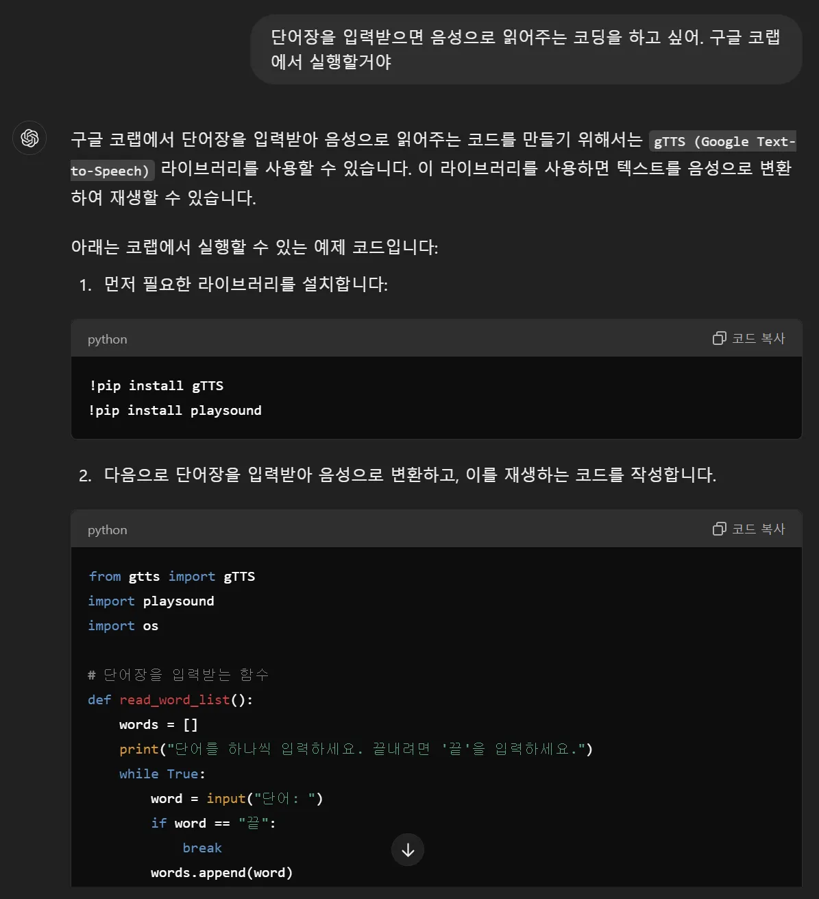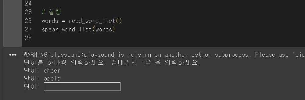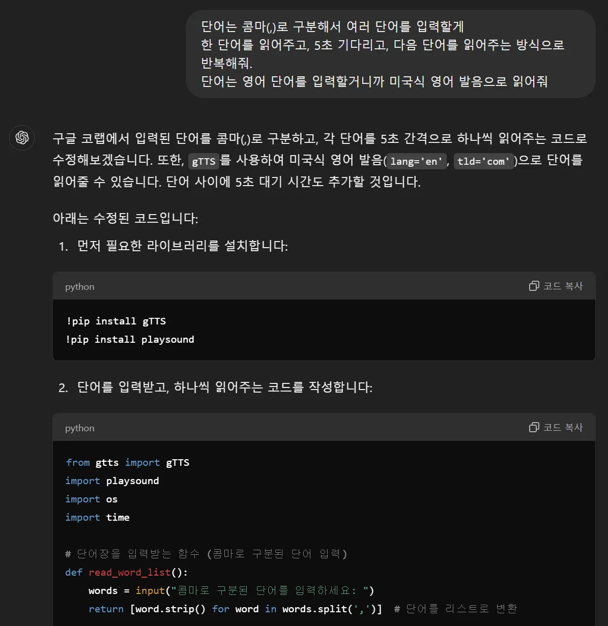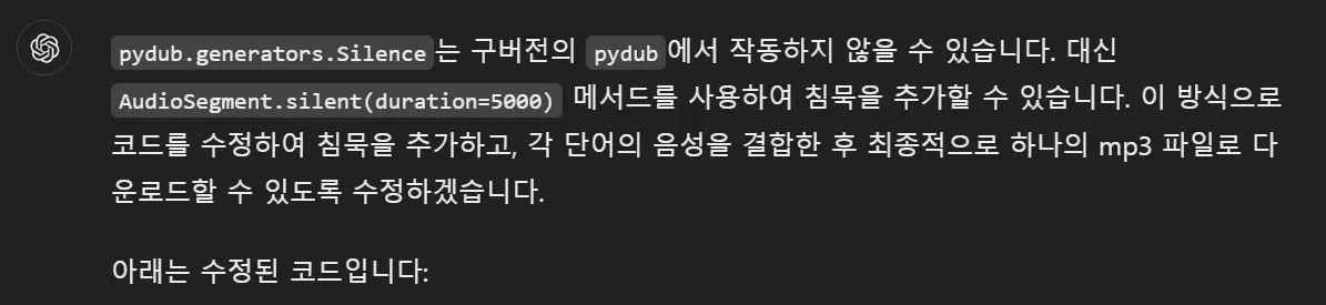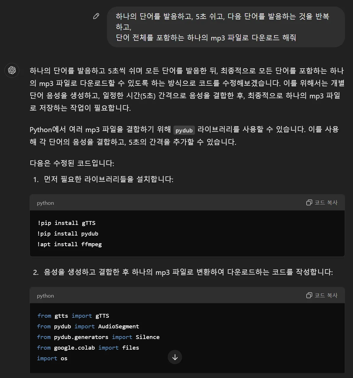 combined_audio += word_audio + silence # 단어 뒤에 5초 간격 추가