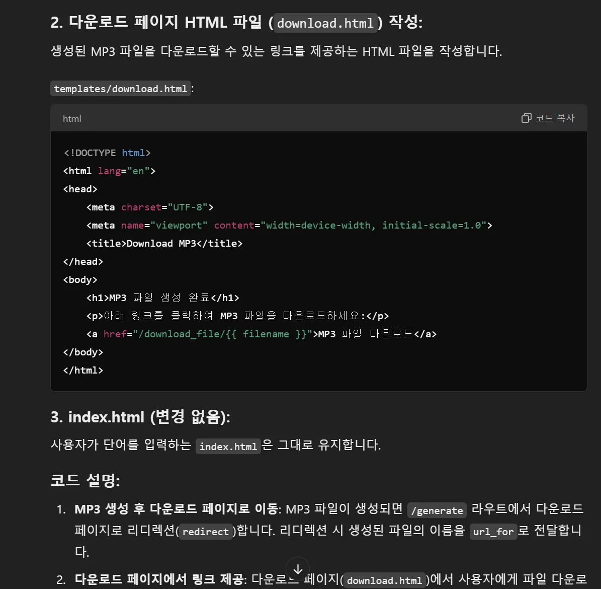 그렇게 만들어진 mp3 파일을 다운로드 받을 수 있는 페이지를 download.html로 만들라 하네요.