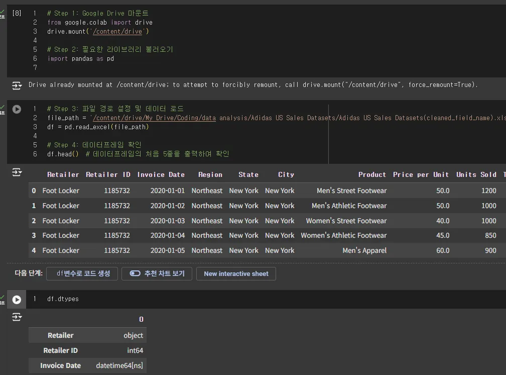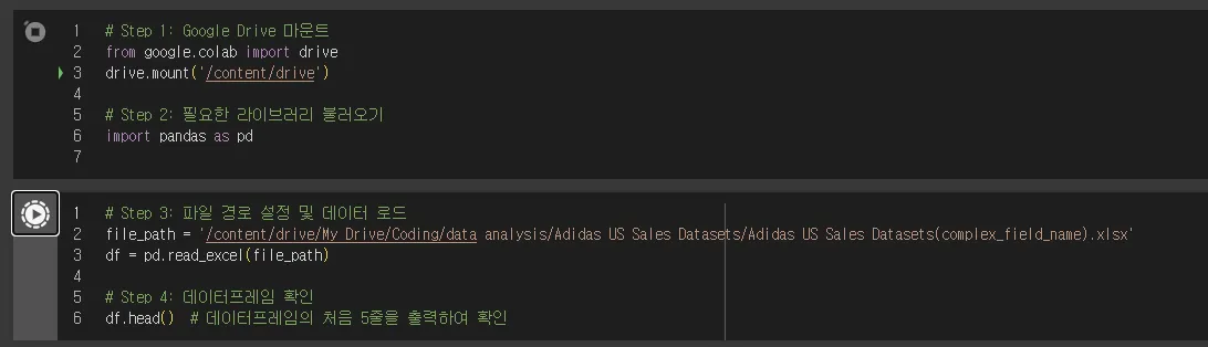 구글 코랩을 마운트해서, 구글 드라이브에 있는 엑셀 파일을 바로 인식시킵니다.