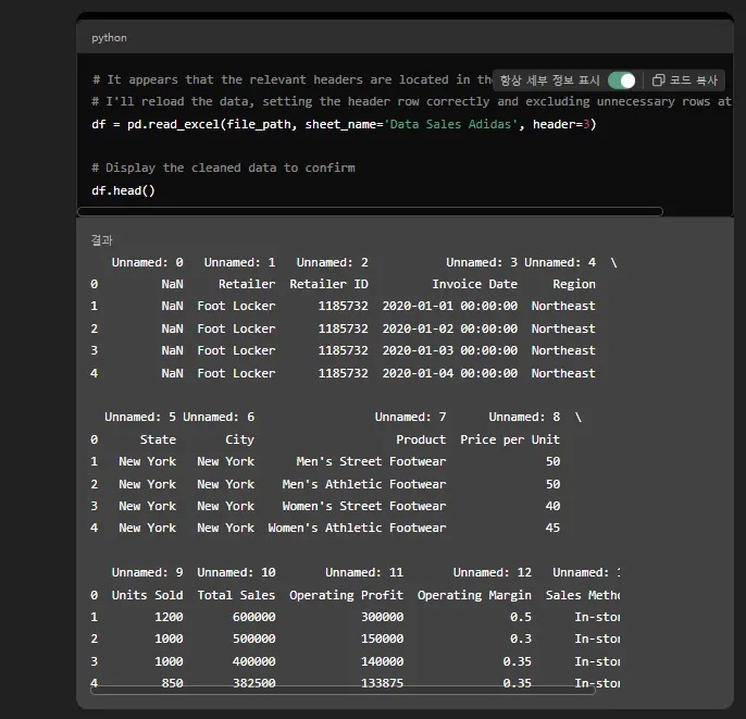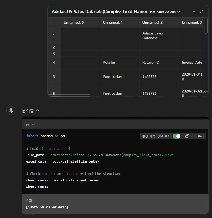 위 GPT의 코드를 보면 텅 빈 1행을 칼럼명으로 인식해버렸고,