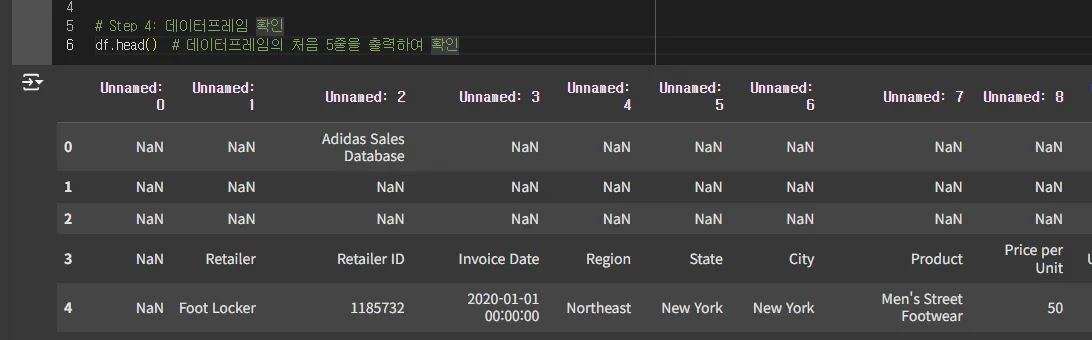 4행에 있던 칼럼명이 데이터프레임의 칼럼으로 들어가지 못하고 그냥 4번째 데이터로만 들어가버렸죠.