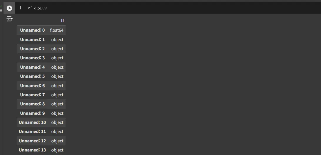 이 상태에서 df의 dtypes를 출력시켜보면 대부분 object로 되어있습니다.