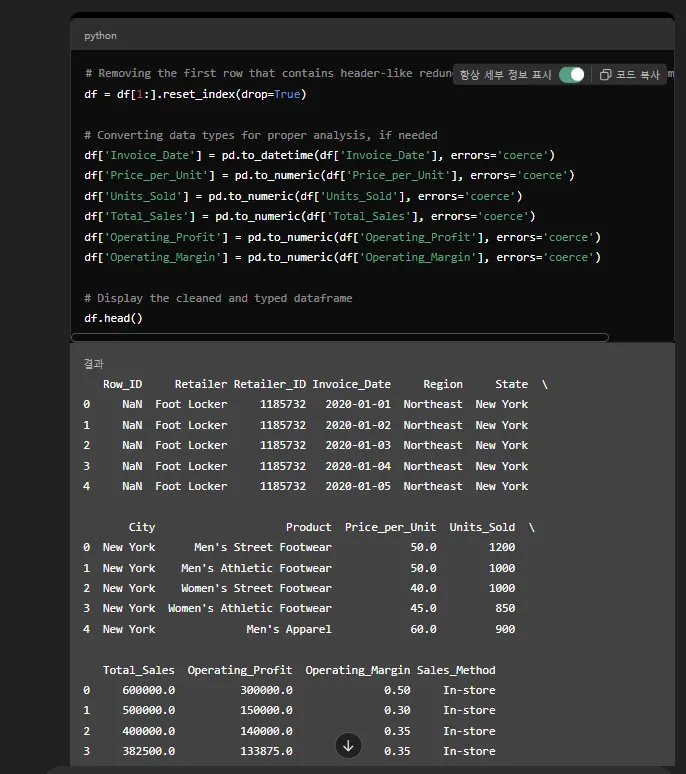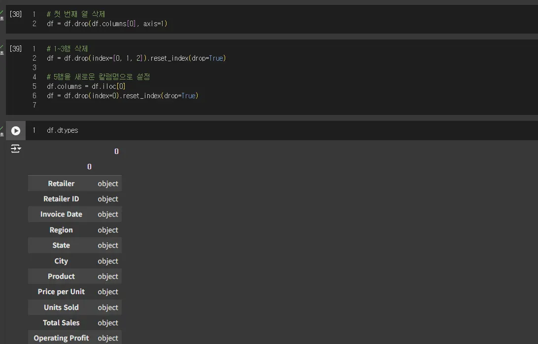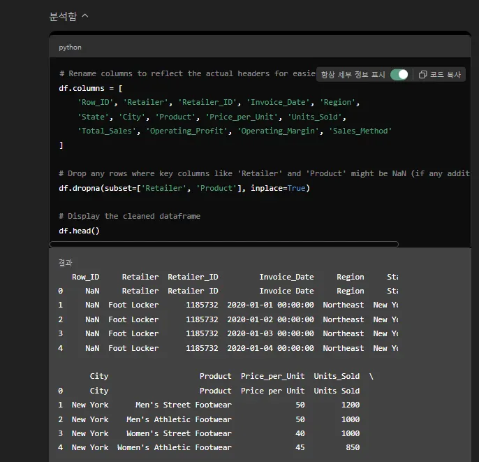 행 3개를 삭제하는 코드, 칼럼명을 다시 설정하는 코드를 적용해서 데이터를 깔끔하게 정리했습니다.